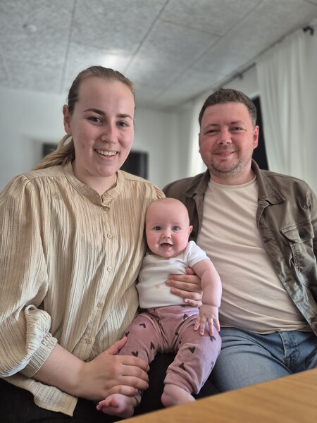 I Give bor Anne (26) og Rasmus (31) sammen med deres datter Elina Sofia. Anne er på barsel og studerer til katastrofe- og risikomanager, mens Rasmus arbejder som portør i Billund Lufthavn.